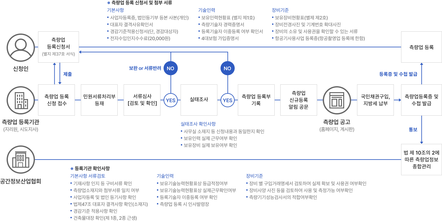 ※ 측량업 등록변경 접수 방법: 우편등기 또는 방문 신청 또는 온라인 신청* 우편 접수 주소: 경기도 수원시 월드컵로 92, 국토지리정보원 측량업 담당 ** 온라인 신청 사이트: '측량업정보 종합관리시스템'
