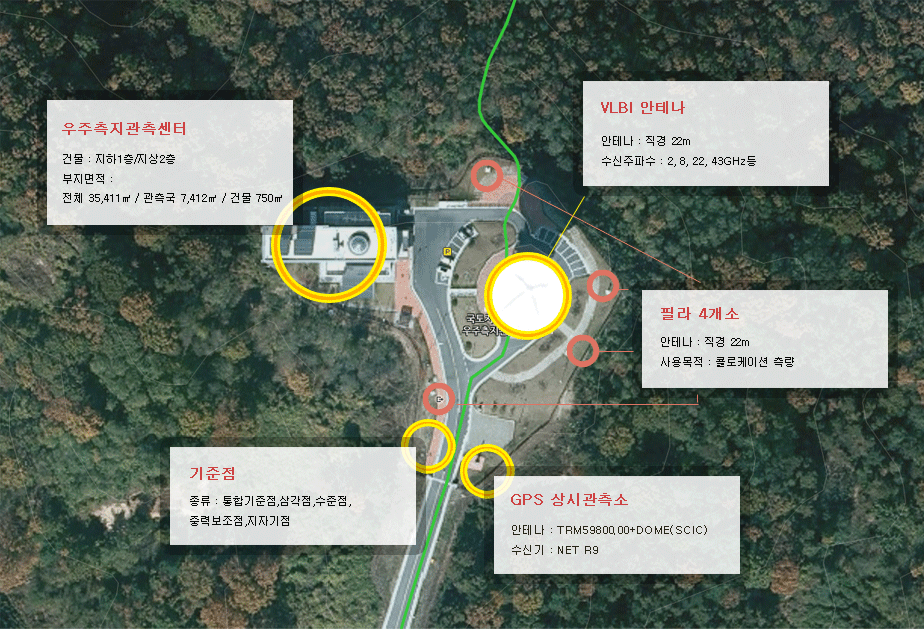 본 관측센터는 우주측지관측센터를 중심으로 VLBI 안테나, 필라 4개소, 기준점 및 GPS 상시관측소로 구성되어 있습니다.